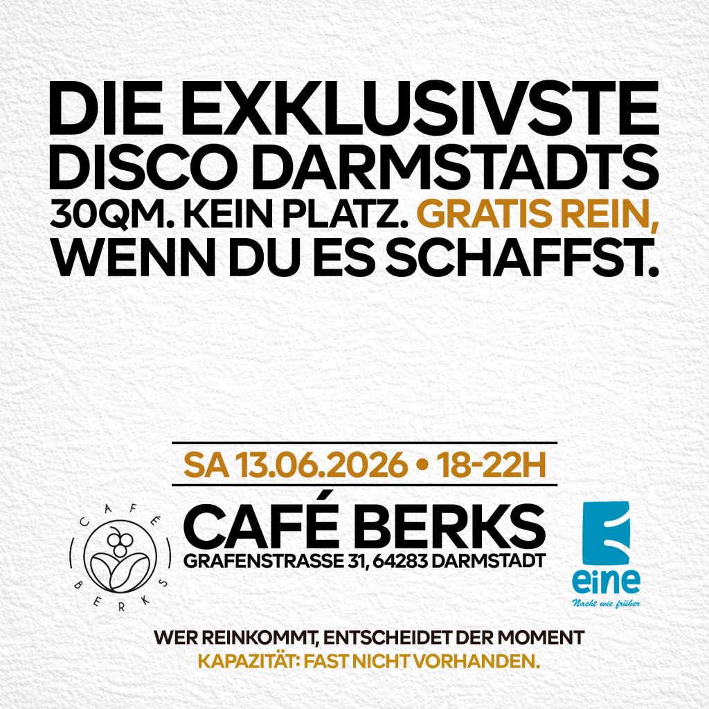 Mit „Die exklusivste Disco Darmstadts“ entsteht am Samstag, den 13. Juni 2026, ein Event, das bewusst gegen klassische Clublogik arbeitet. Auf nur 30 Quadratmetern verwandelt sich das Café Berks in der Grafenstraße 31 für vier Stunden in einen temporären Dancefloor – reduziert, direkt und kompromisslos.